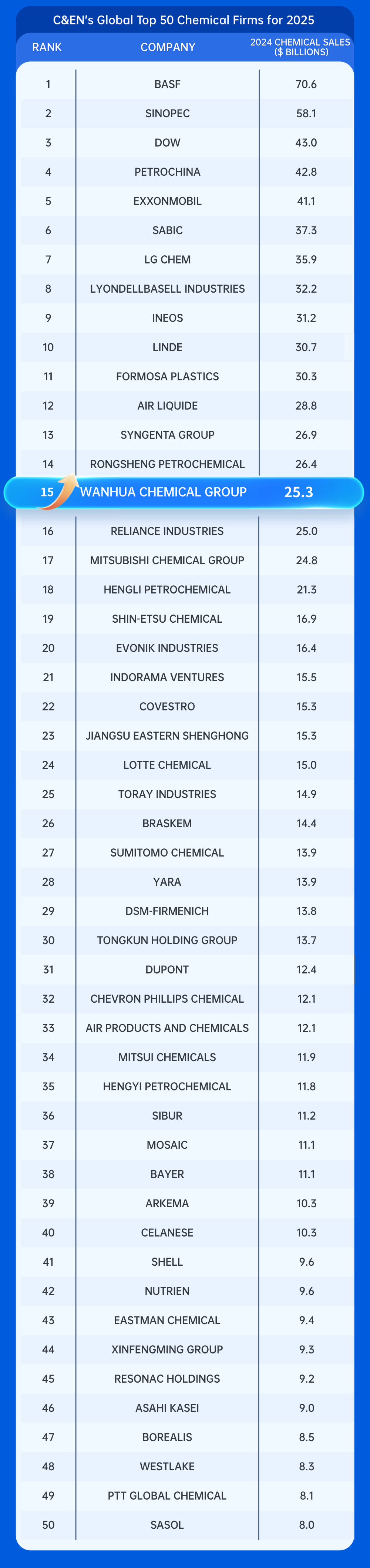 7月23日,C&EN(《化學與工程新聞》)發(fā)布最新全球化工企業(yè)50強排行榜(Global Top 50 Chemical Firms),對全球范圍內主要化工企業(yè)進行了排名,萬華化學位列第15位,較去年上升1位。